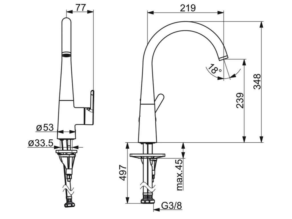 Drezová stojanková batéria HANSADESIGNO značky Hansa s otočným výtokovým ramienkom opatreným CASCADE® - aerátorom. Rozsah otáčania ramienka možno obmedziť.