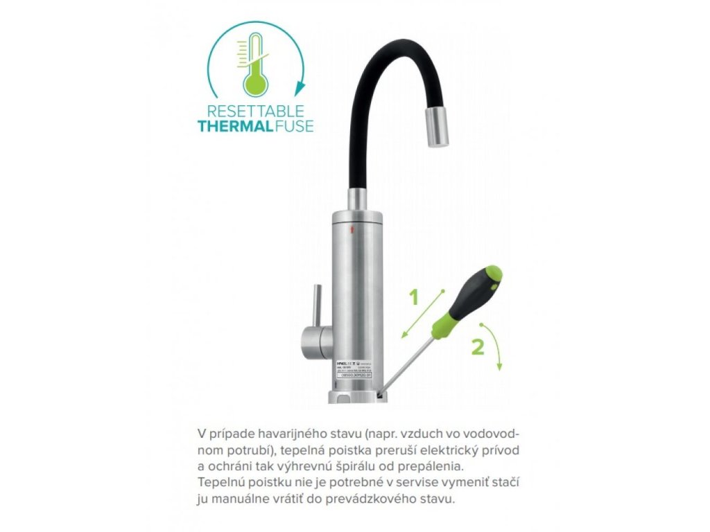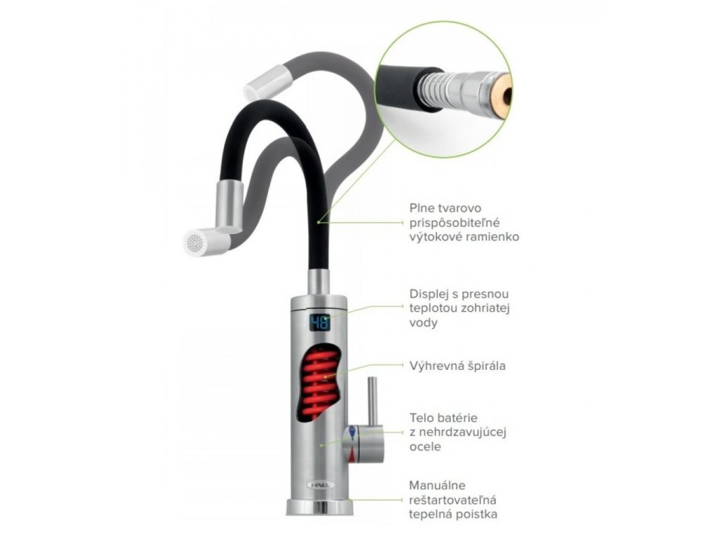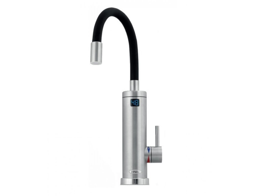 Dizajnová elektrická priamoohrevná vodovodná batéria značky HAKL má flexibilné tvarovateľné výtokové ramienko.
