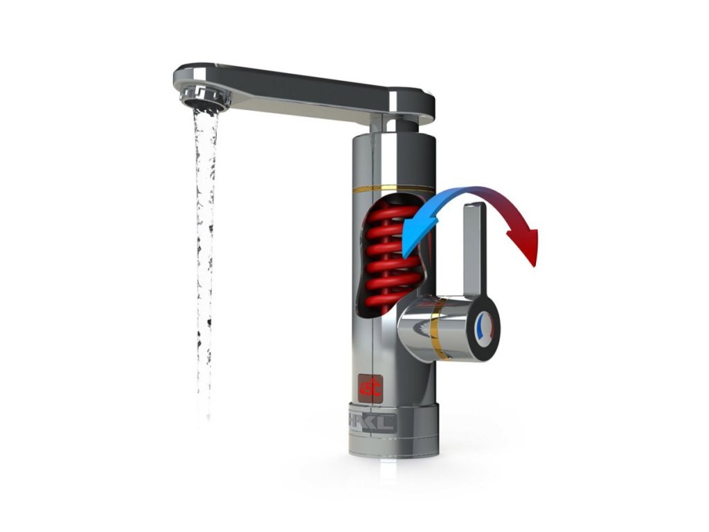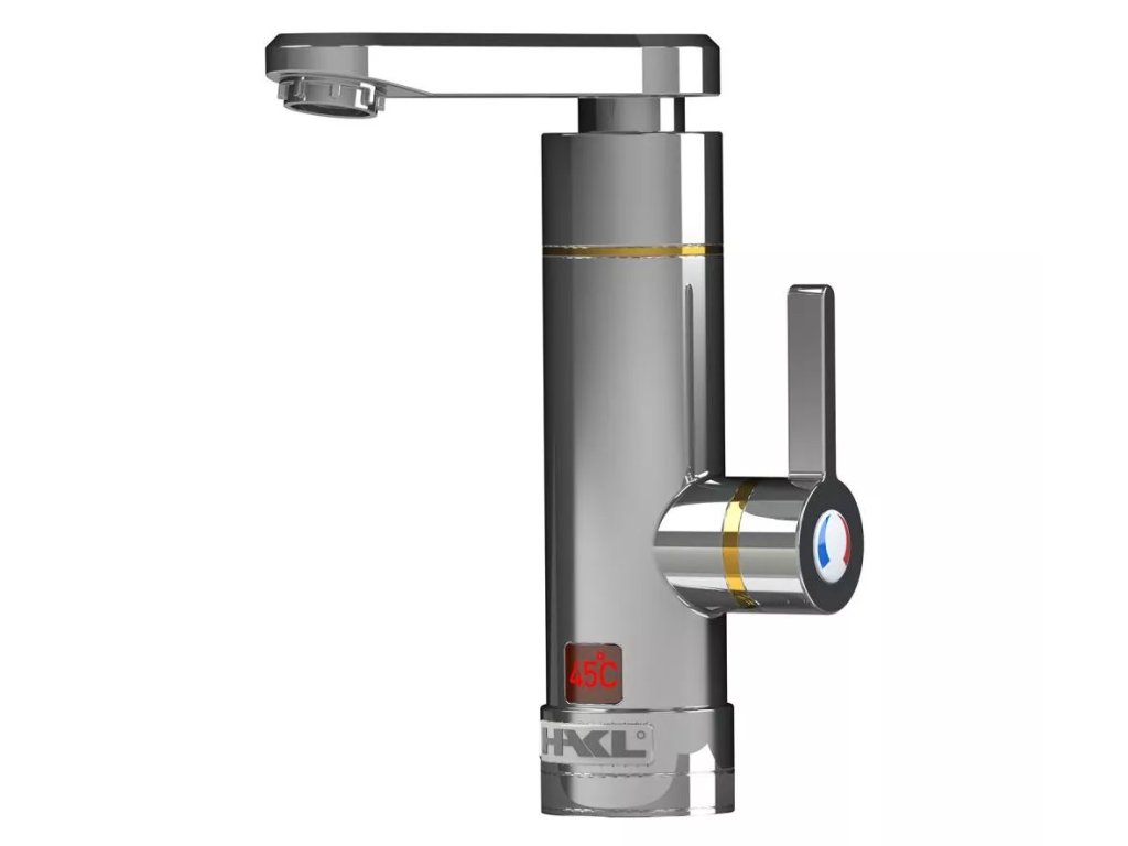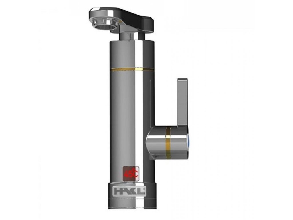 Dizajnová elektrická priamoohrevná vodovodná batéria značky HAKL. S aktívnym perlátorom, ktorý mení prietok vody v závislosti od množstva pretečenej vody. Výtokové ramienko je otočné o 360°.