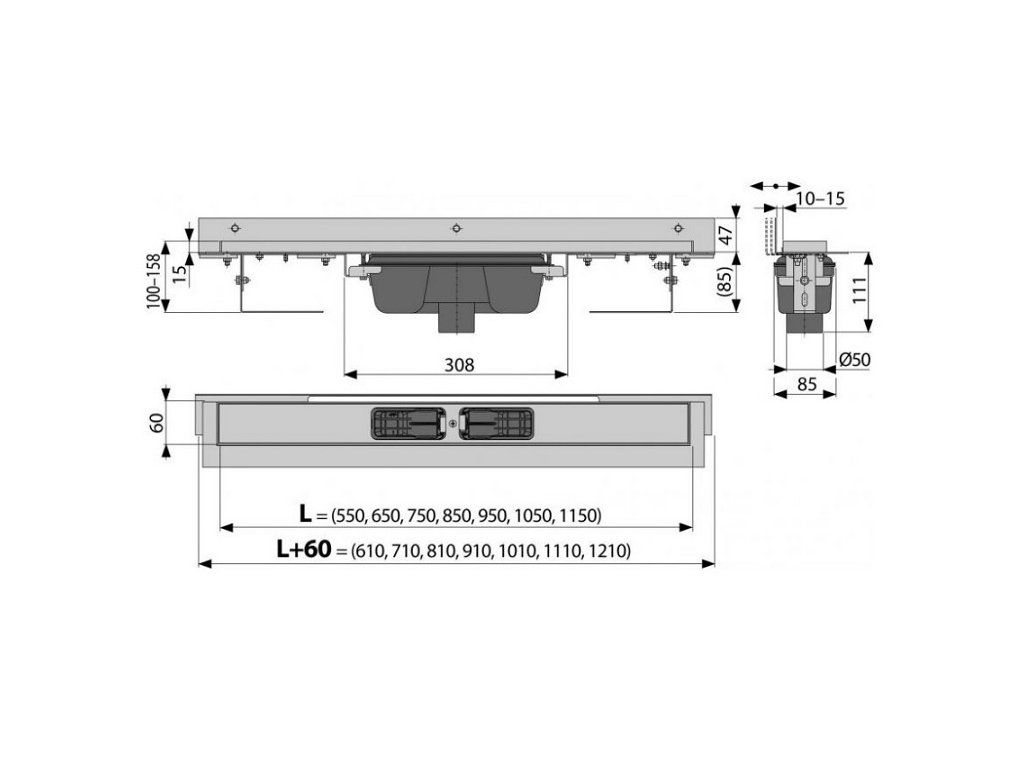 Sprchový žľab FLEXIBLE okraj pre perforovaný rošt, zvislý odtok, 850mm
