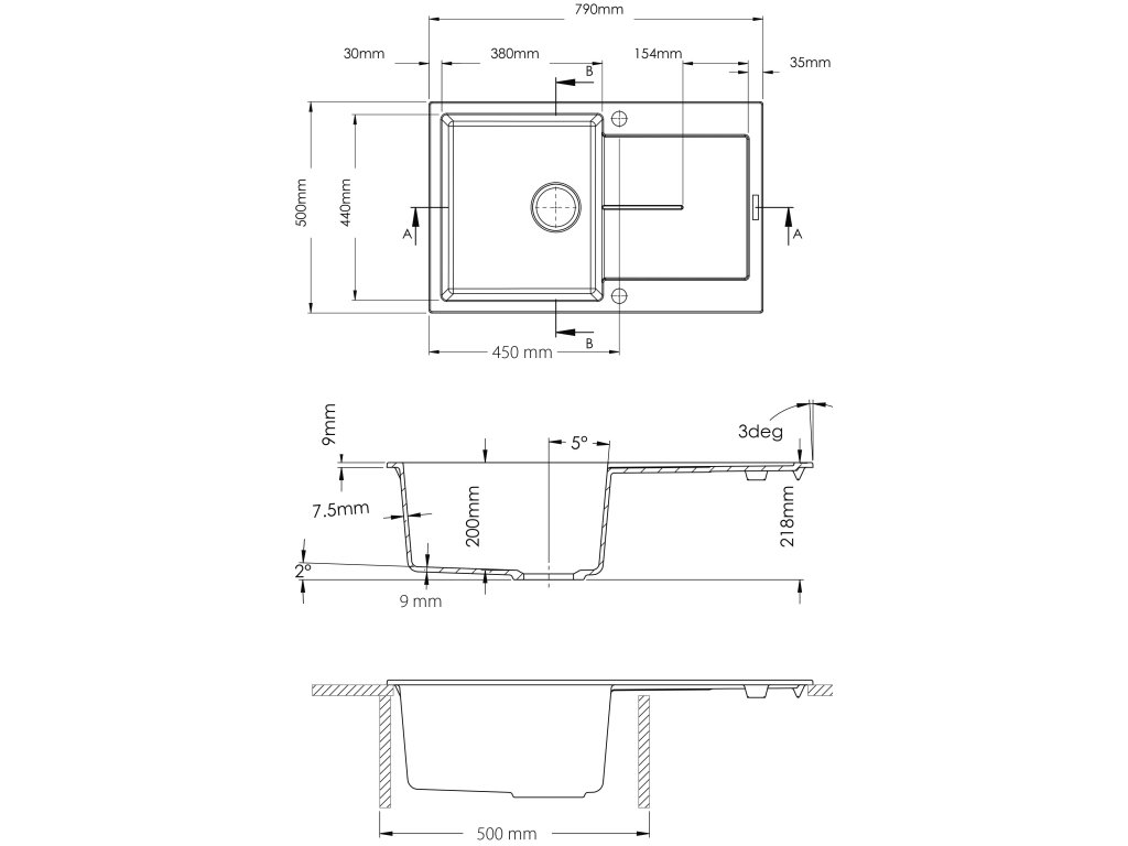 Vonkajšie rozmery drezu: 790 x 500 mm.
