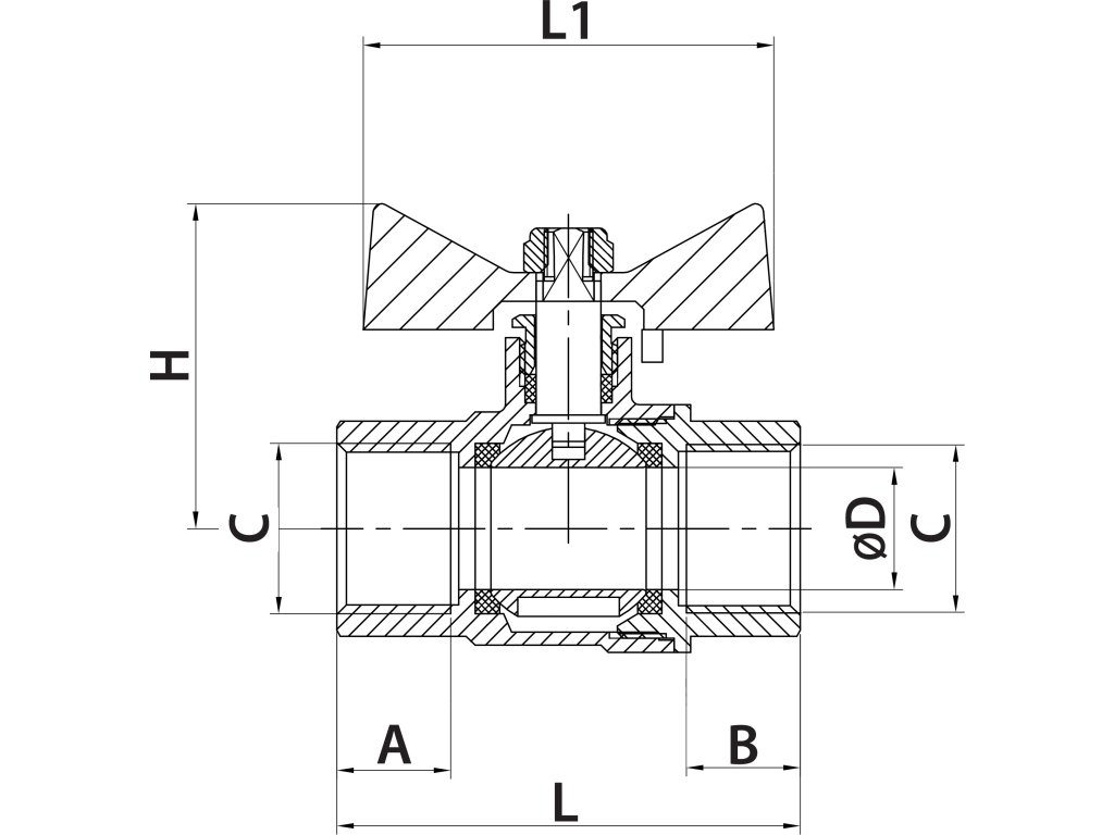 Guľový ventil s motýľom, 1" FF závit vnútorný/vnútorný, PN40