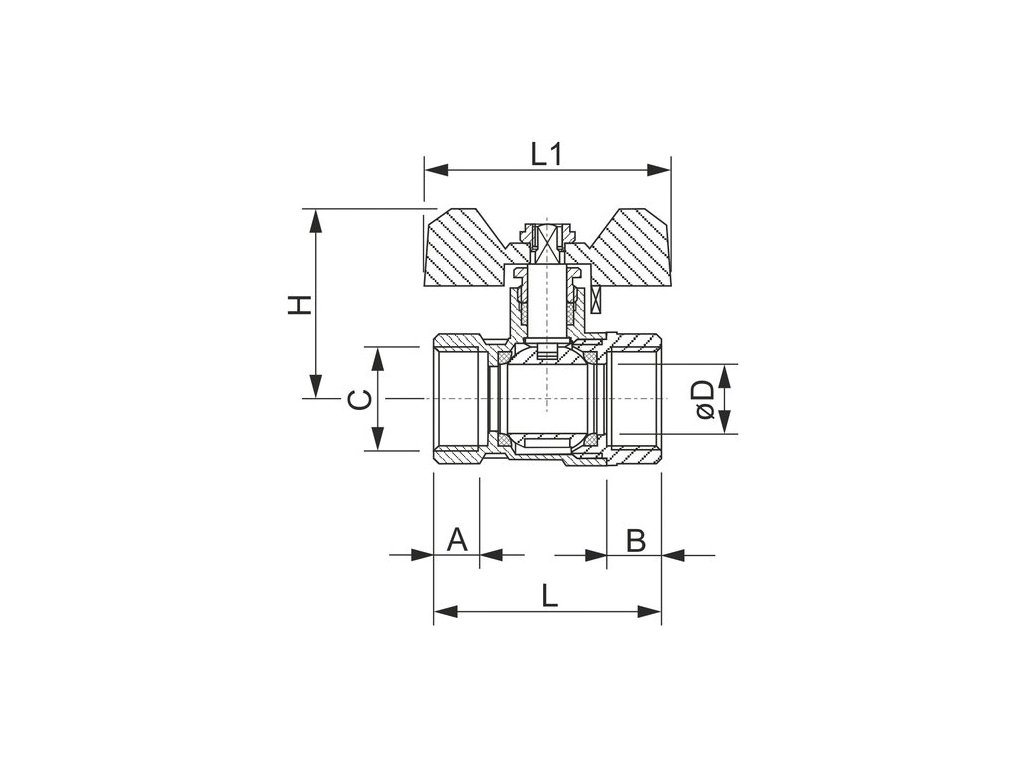 Guľový ventil s motýľom, 3/4" FF závit vnútorný/vnútorný, PN25