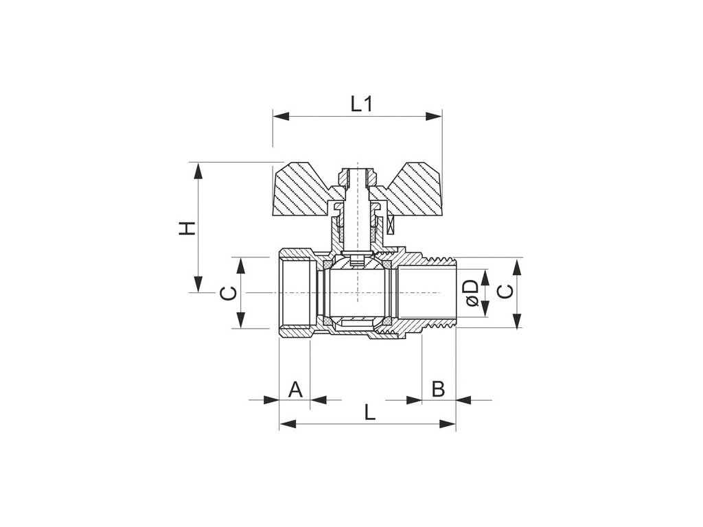 Guľový ventil s motýľom, 3/4" MF závit vonkajší/vnútorný, PN25
