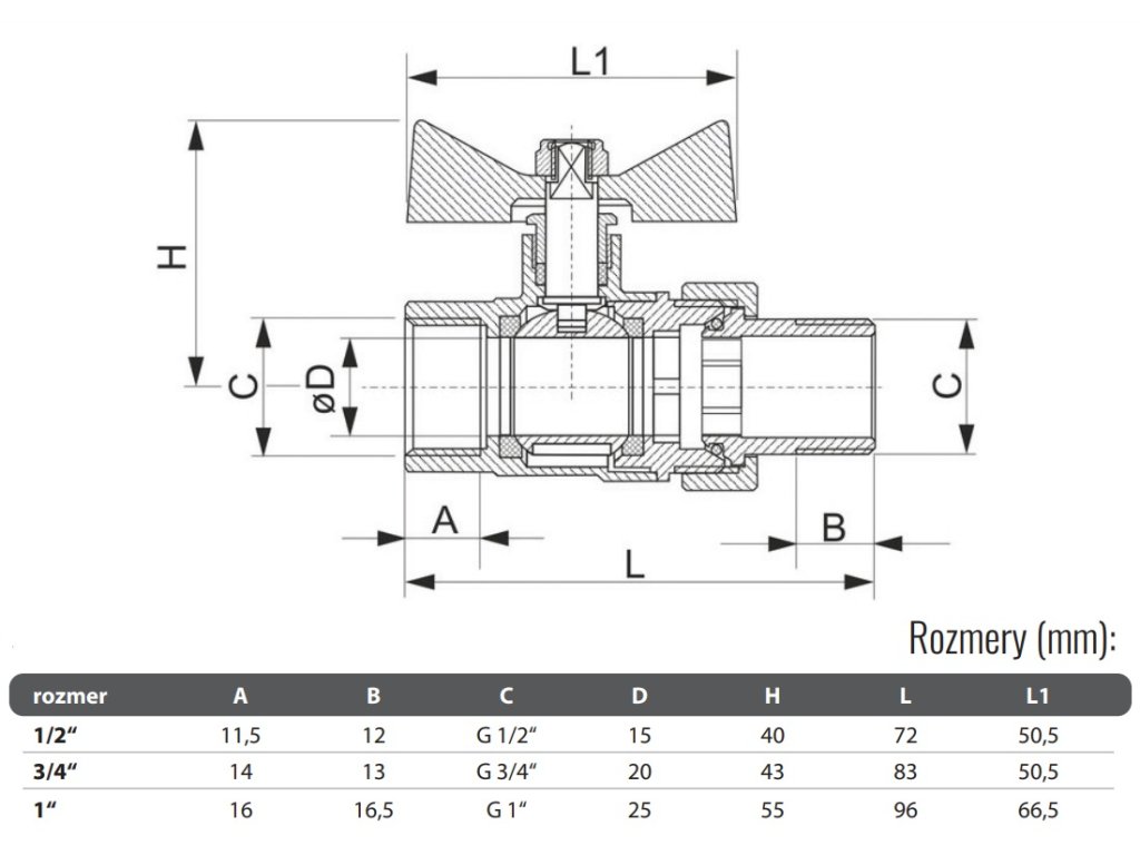 Guľový ventil s motýľom, s prevlečnou maticou MF, závit 1", PN40