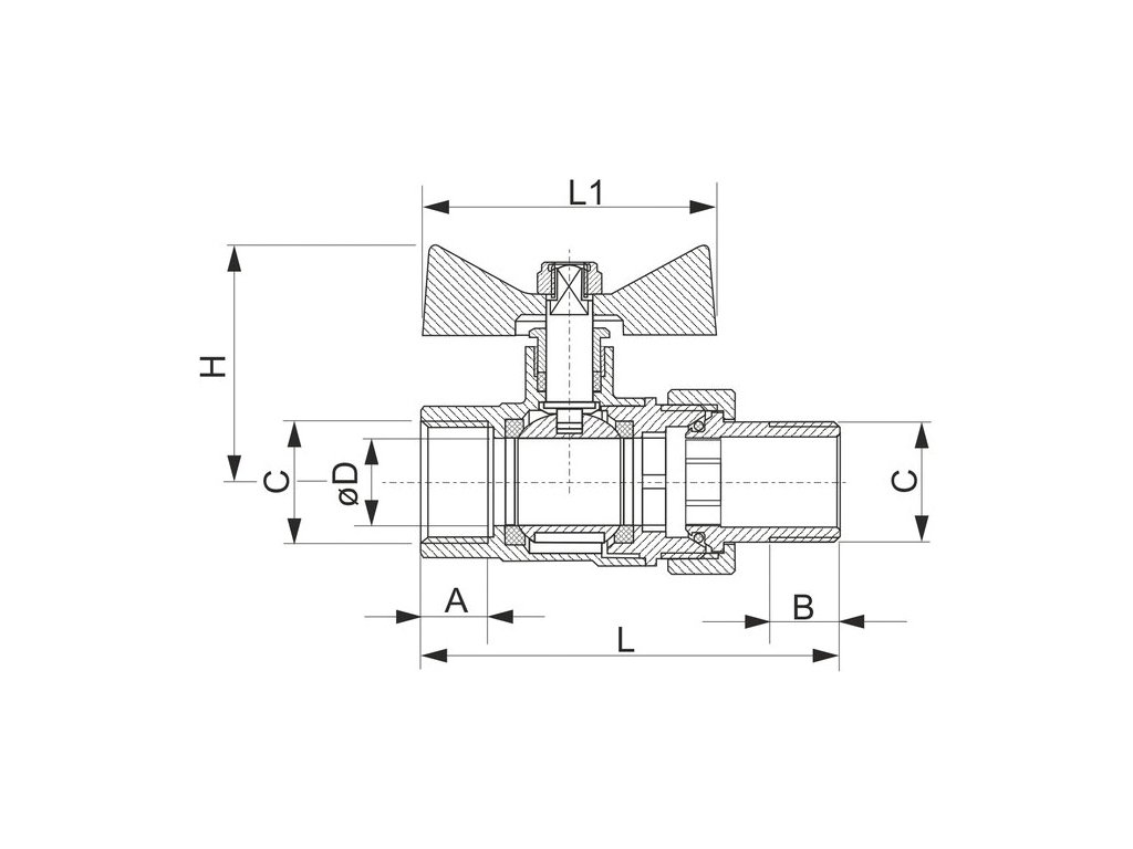 Guľový ventil s motýľom, s prevlečnou maticou MF, závit 3/4", PN40