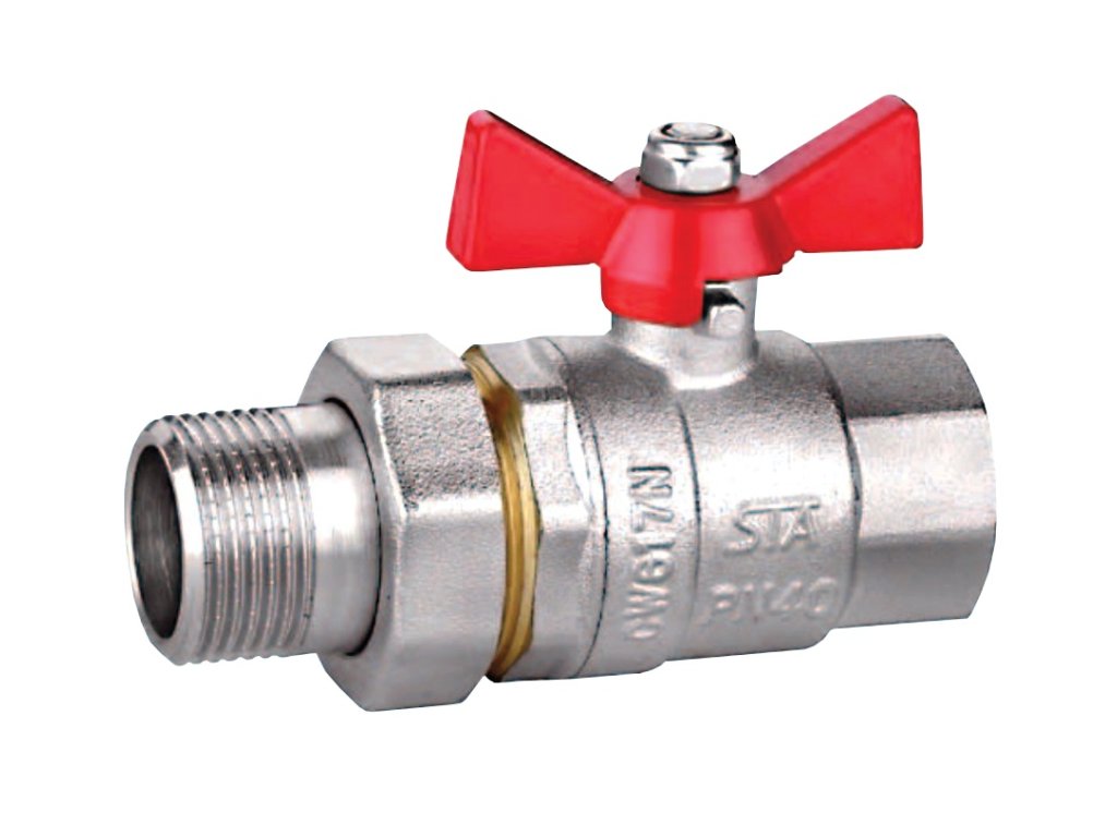 Guľový ventil značky STA, s prevlečnou maticou MF, s motýľom, PN40, certifikovaný na pitnú vodu: povrch prichádzajúci do kontaktu s pitnou vodou nie je poniklovaný.