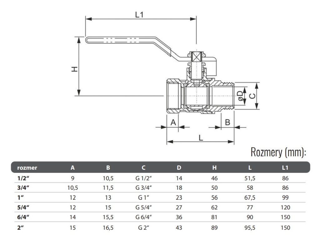 Guľový ventil s pákou, 6/4" MF závit vonkajší/vnútorný, PN25