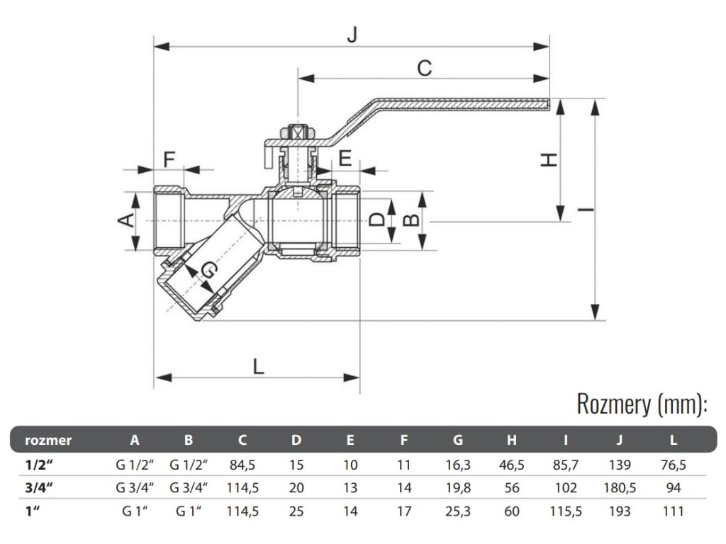 Guľový ventil s pákou, s filtrom, závit 3/4" FF, PN25