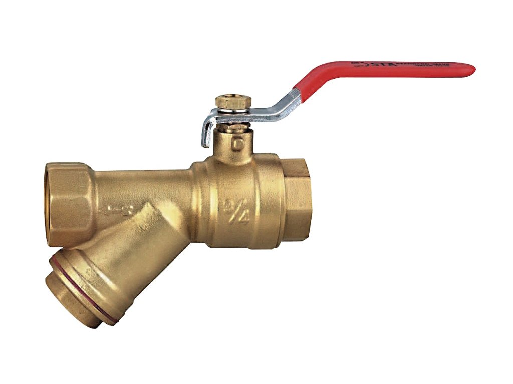 Guľový ventil značky STA, s filtrom FF, s pákou, PN25, certifikovaný na pitnú vodu: povrch prichádzajúci do kontaktu s pitnou vodou nie je poniklovaný.