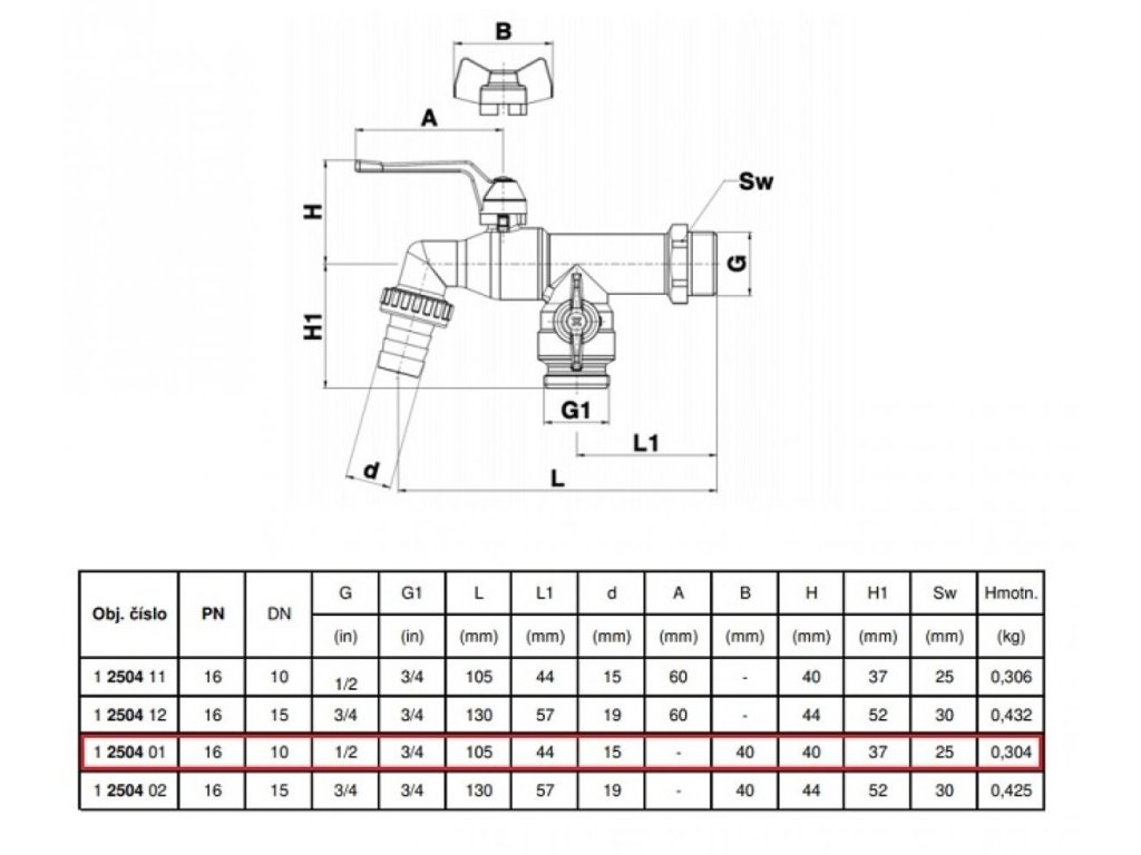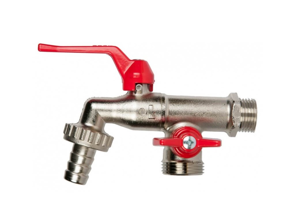 Guľový kohút na úžitkovú vodu s hadicovou prípojkou, pákovým ovládačom a vypúšťacím ventilom ako druhým výtokom s vonkajším závitom G 3/4" uzatvárateľným samostatným guľovým kohútom s motýlikovým ovládačom.