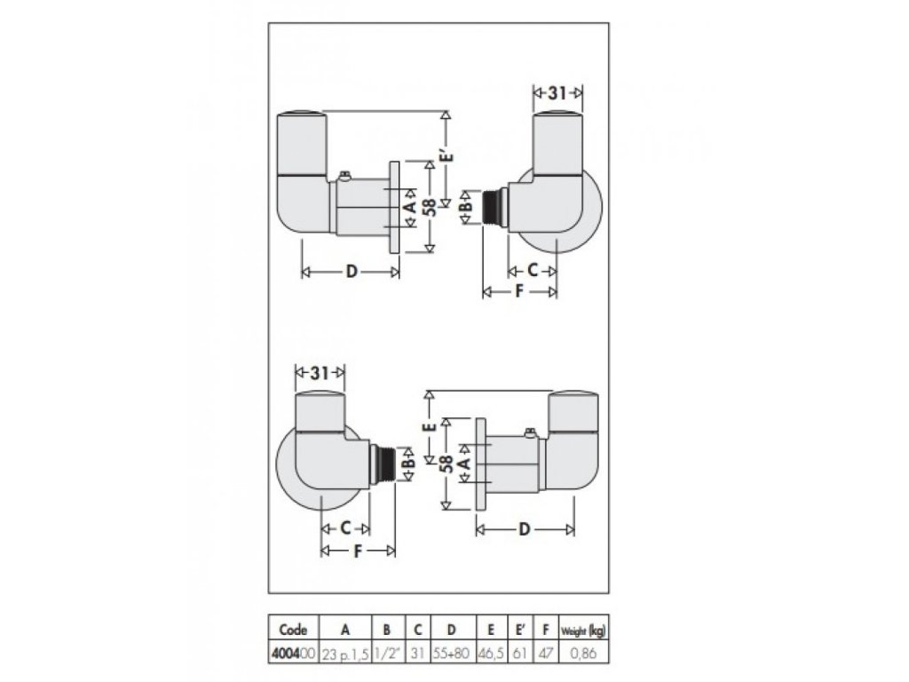 • nastaviteľný radiátorový rohový ľavý ventil - 2ks, s možnosťou použitia termostatickej hlavice (kód 200015)