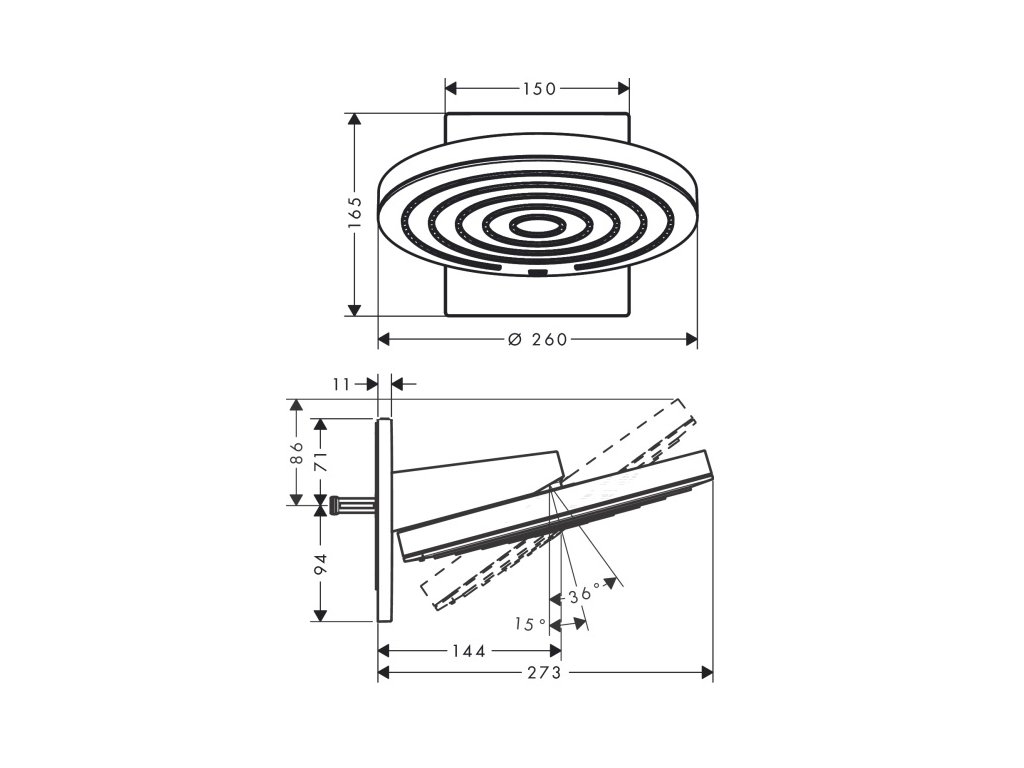 Dvojpolohová horná sprcha PULSIFY S s nástenným pripojením. S guľovým kĺbom umožňujúcim nastaviť uhol hornej sprchy.