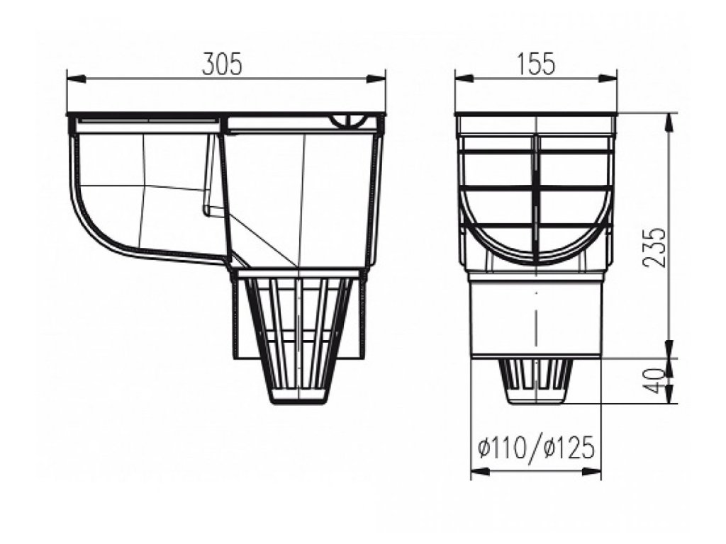 Použitie: pre odvod dažďových (povrchových) vôd do kanalizačných systémov mimo budov. Umožňuje pripojenie odkvapových zvodov.
