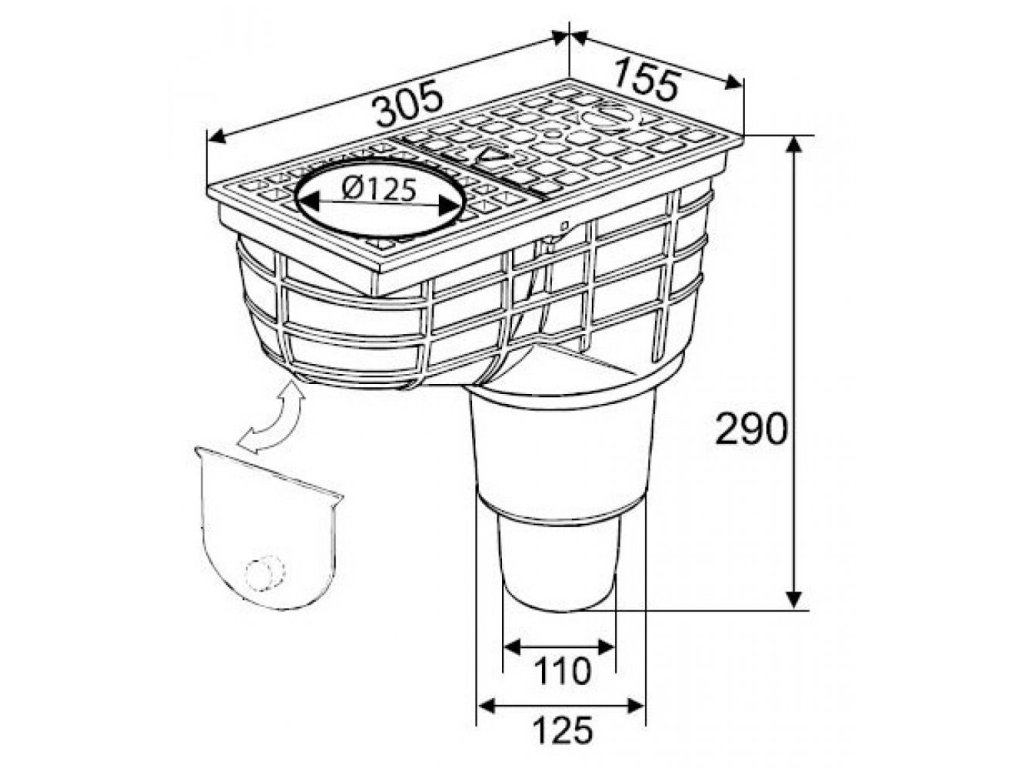 Použitie: pre odvod dažďových (povrchových) vôd do kanalizačných systémov mimo budov. Umožňuje pripojenie odkvapových zvodov.