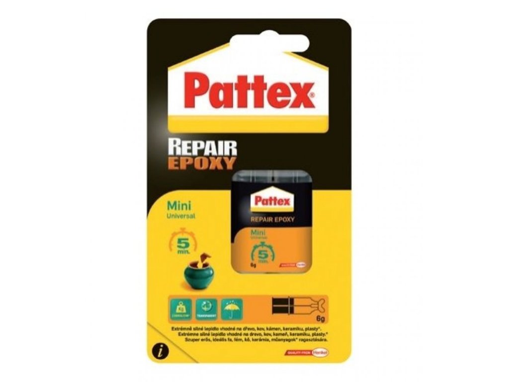 Pattex Repair Epoxy Mini Universal je univerzálne dvojzložkové epoxidové lepidlo značky Henkel. Bez prchavých rozpúšťadiel.