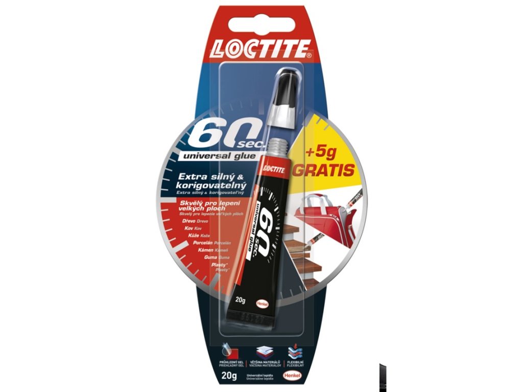 LOCTITE® 60 sekúnd výrobcu Henkel je rýchloschnúce jednozložkové gélové lepidlo na univerzálne použitie v domácnosti. Vďaka gélovej konzistencii nesteká, a preto je vhodné na lepenie vodorovných aj zvislých povrchov. Spoj je možné upraviť počas prvých 20 sekúnd, fixácia nastáva približne po 60 sekundách. Lepidlo vytvára pevné a pružné spoje, je odolné voči otrasom aj vode (podľa normy EN204-D3), nie je však určené na trvalý kontakt s vlhkosťou. Je perfektné pre aplikácie, kde je vyžadovaná flexibilita spoja.