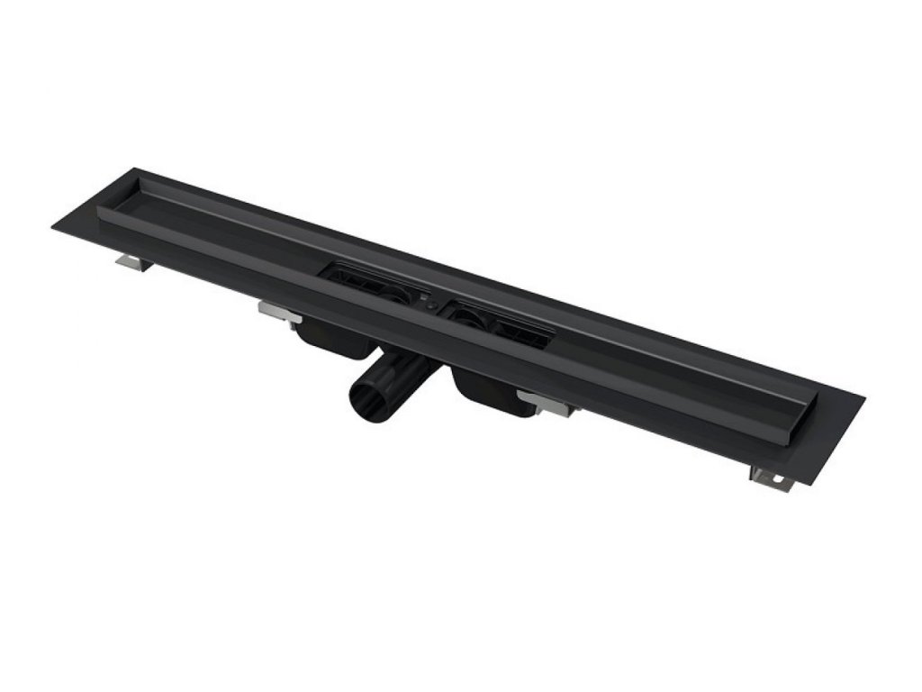 LOW - podlahový žľab značky Alcaplast, s okrajom pre perforovaný rošt, v matnej čiernej povrchovej úprave.