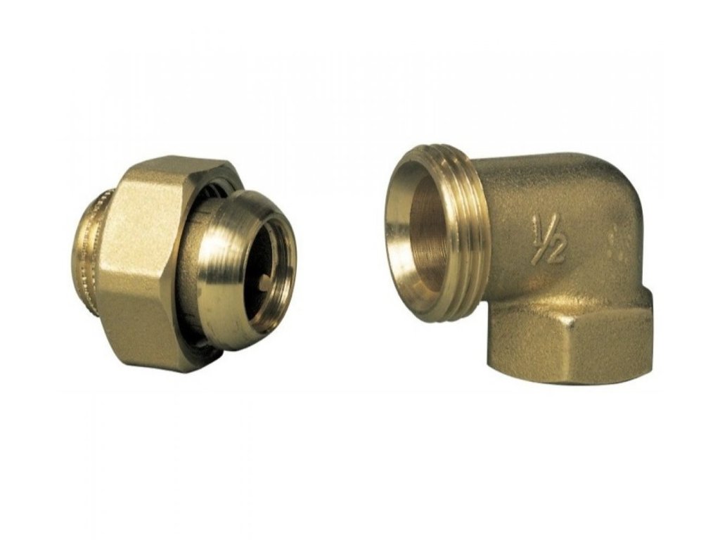 Mosadzná radiátorová závitová spojka rohová, kónická, kov na kov, 1/2".