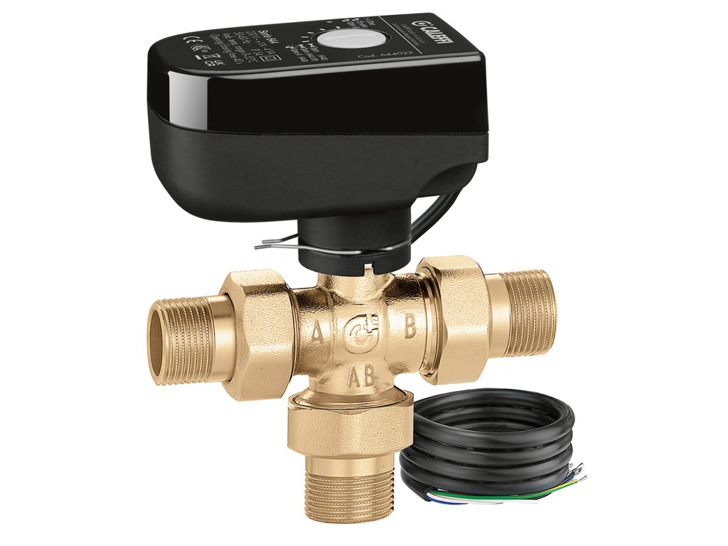 Motorizovaný trojcestný guľový prepínací ventil značky Caleffi, s prídavným mikrospínačom.