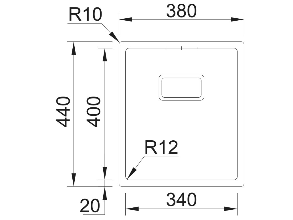 Vonkajšie rozmery drezu: 380 x 440 mm.