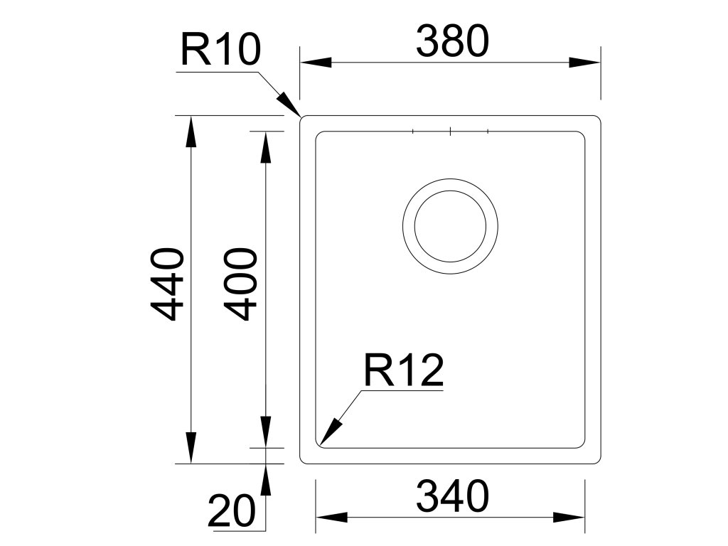 Vonkajšie rozmery drezu: 380 x 440 mm.