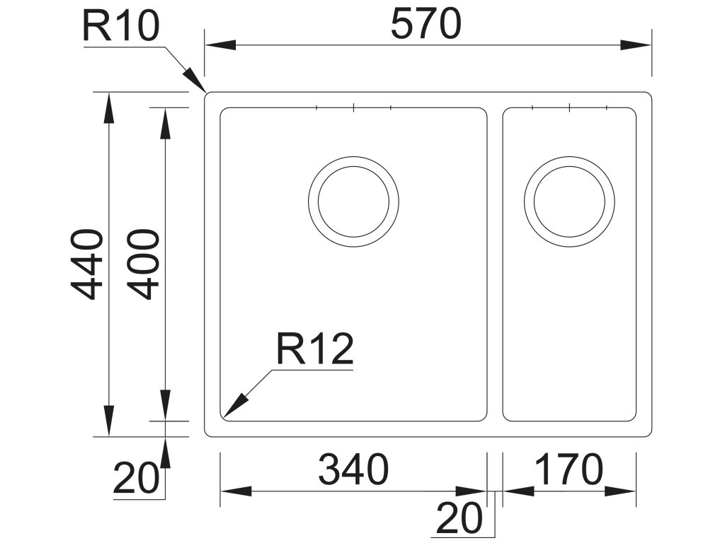 Vonkajšie rozmery drezu: 570 x 440 mm.