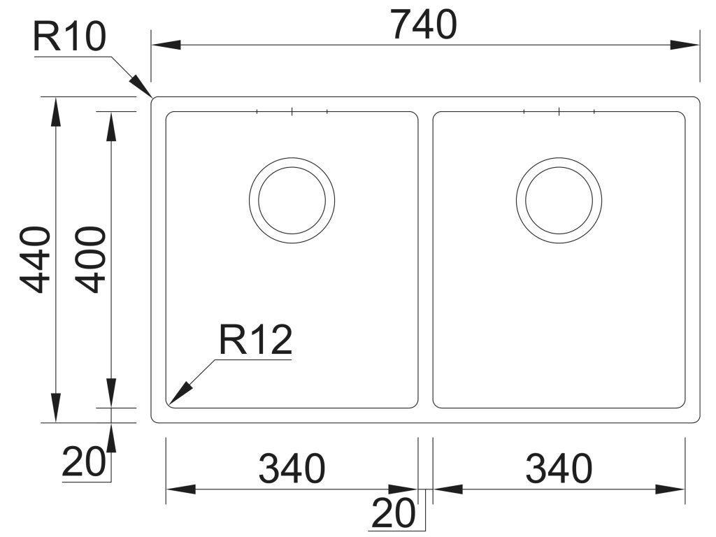 Vonkajšie rozmery drezu: 740 x 440 mm.