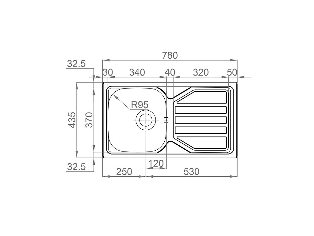 Vonkajšie rozmery drezu: 780 x 435 mm.