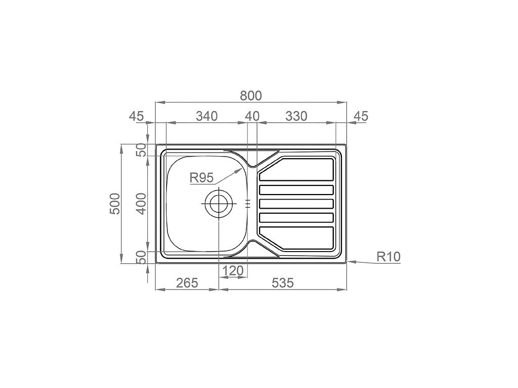 Vonkajšie rozmery drezu sú: 800 x 500 mm.