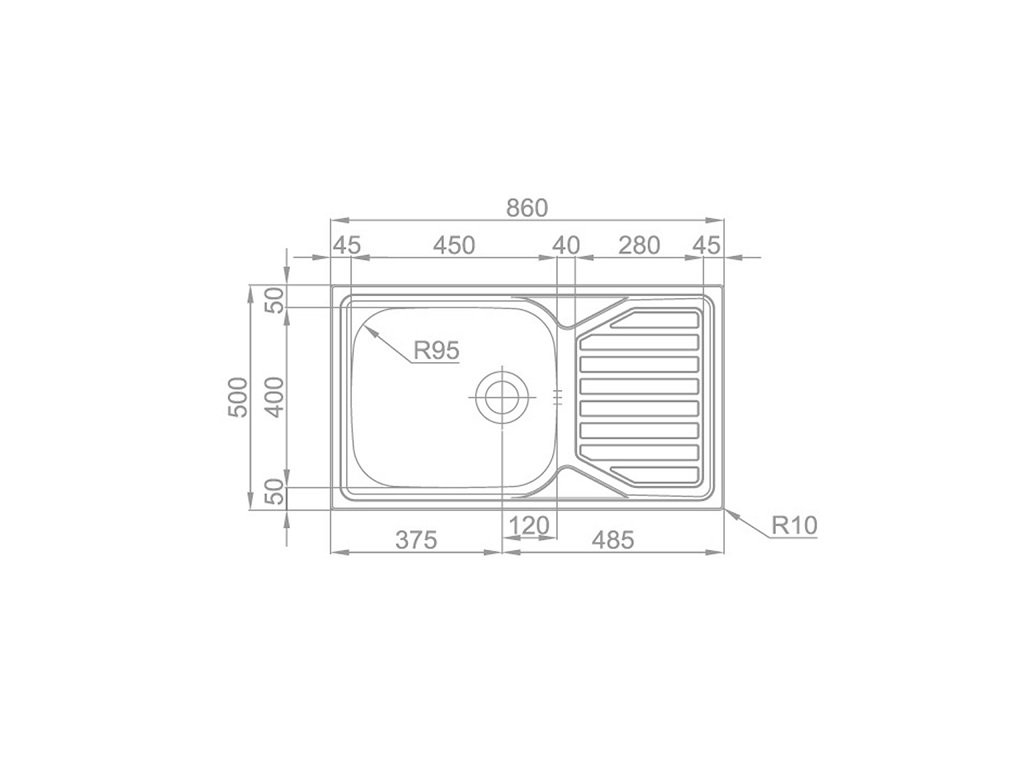 Vonkajšie rozmery drezu: 860 x 500 mm.