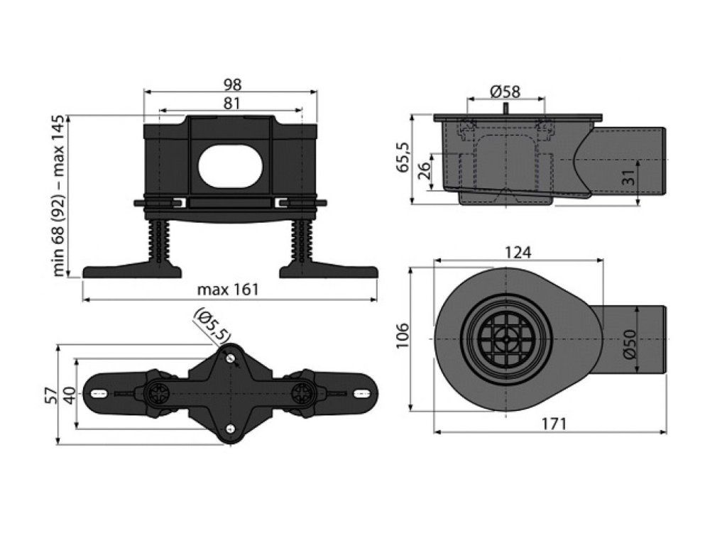 Nízky sprchový sifón DN 50 a sada nastaviteľných nôh