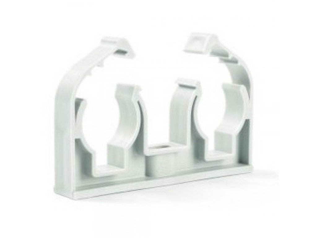 Dvojpríchytka na potrubie, s klipom, biely plast - 2x22mm