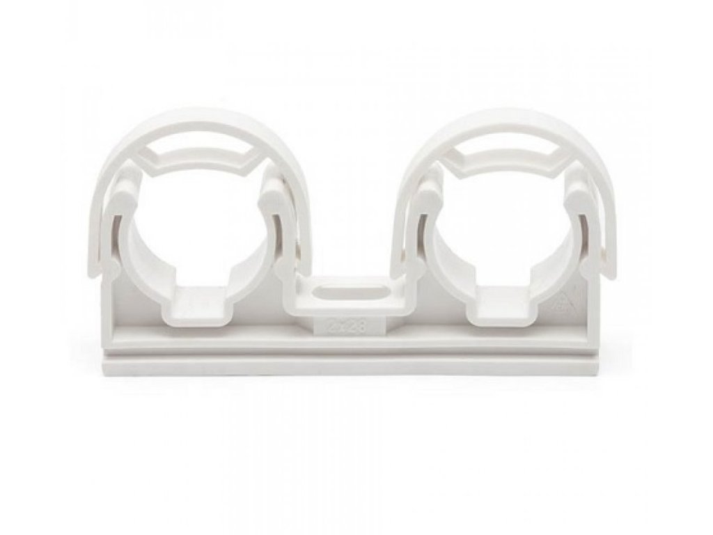 Dvojpríchytka na medené potrubie, so strmeňom, biely plast - 2x28mm