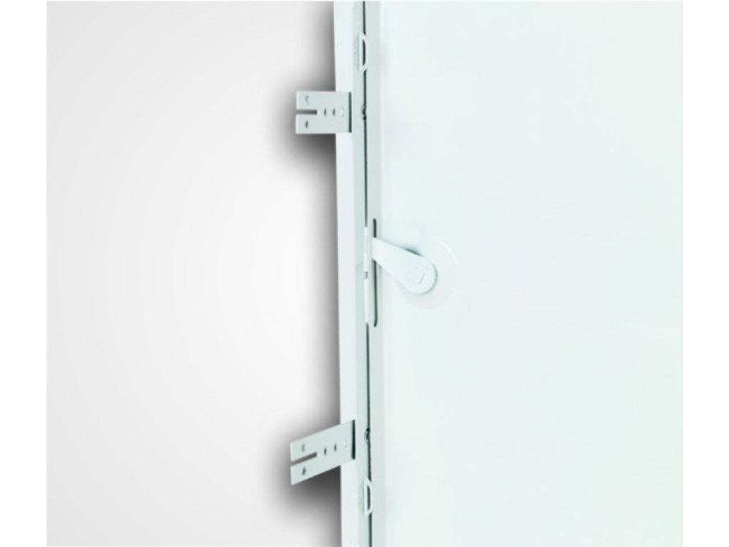 Revízne dvierka pozostávajú zo stabilného vonkajšieho rámu a vnútorných dvierok z pozinkovaného oceľového plechu s integrovaným štvorhranným zámkom. Štandardná farba je biela – RAL9016.