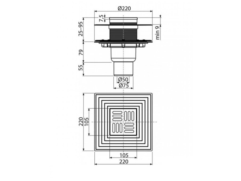Podlahová vpusť značky Alcaplast, 105×105/50/75 mm, priama, s nerezovou mriežkou, nerezovou prírubou a límcom 2. úrovne izolácie, kombinovaná zápachová uzávera SMART