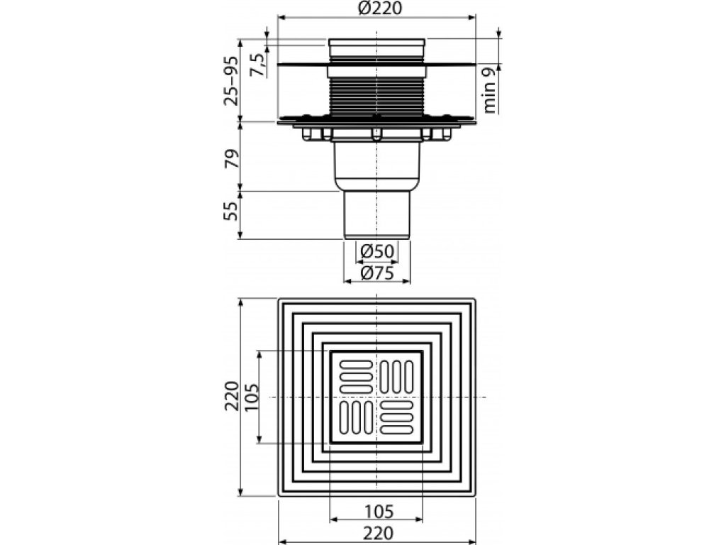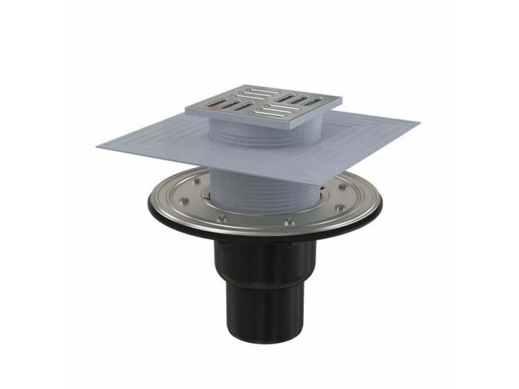 Podlahová vpusť 105×105/50/75 mm priama, mriežka nerez, nerezová príruba a límec 2. úrovne izolácie, vodná a suchá zápachová uzáveraPoužitie: