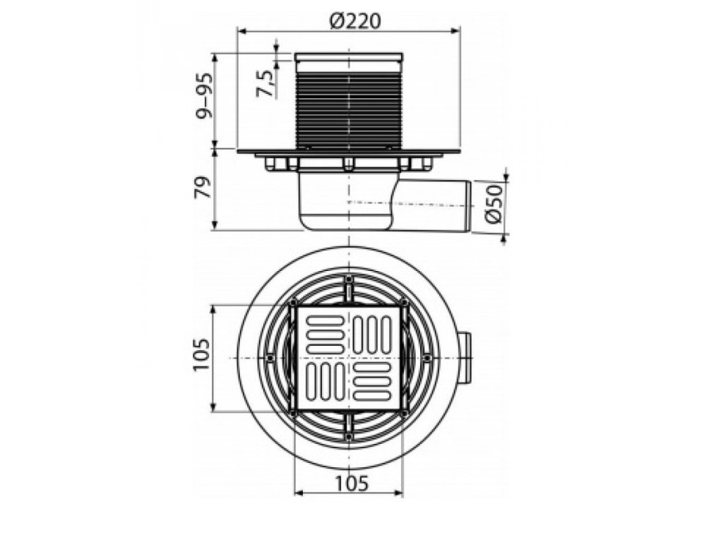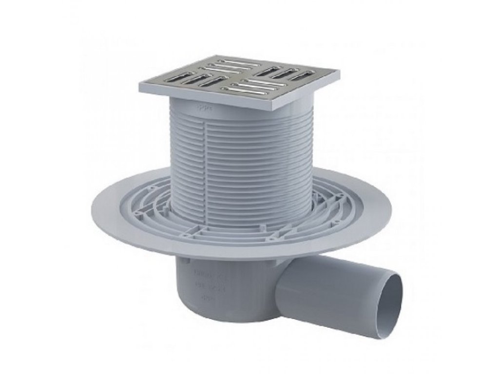 Podlahová vpusť značky Alcaplast, 105x105/50 mm, bočná, s nerezovou mriežkou, kombinovaná zápachová uzávera