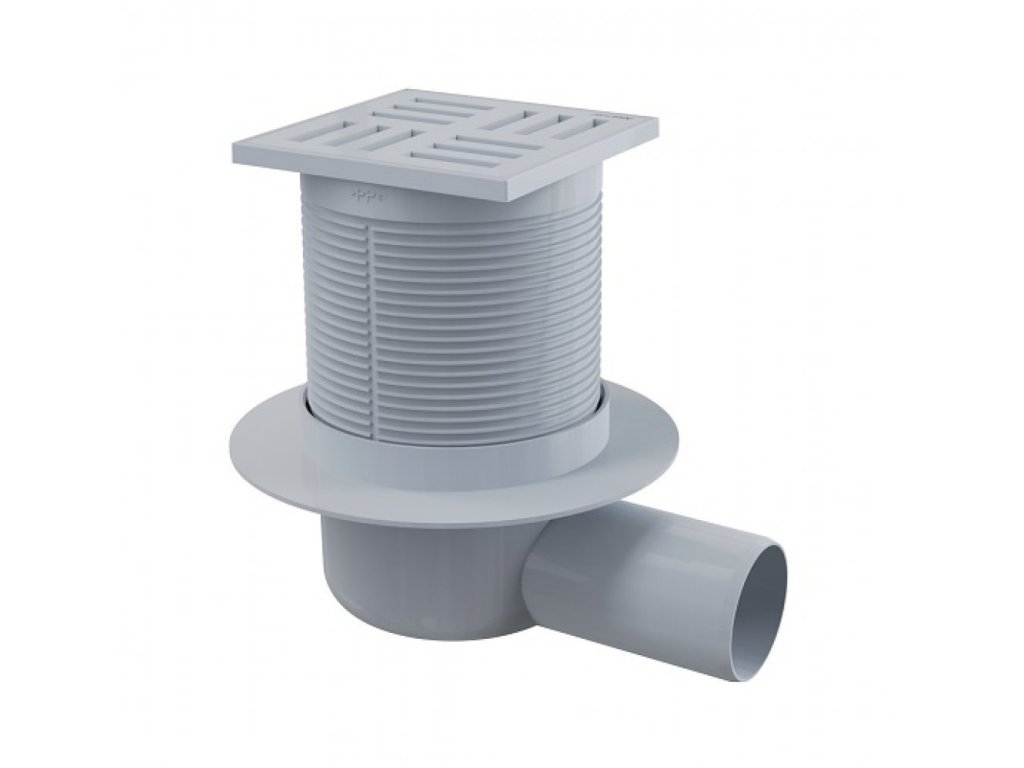 Bočná podlahová vpusť značky Alcaplast, 105 × 105/50, mriežka šedá, vodná zápachová uzávera.