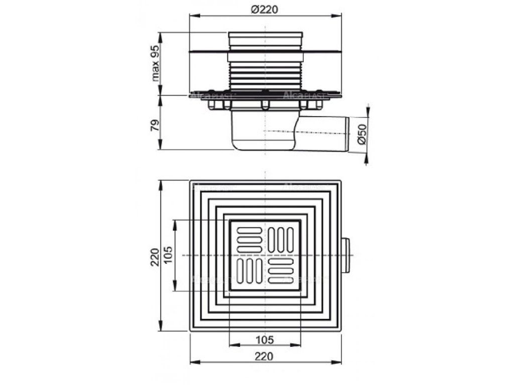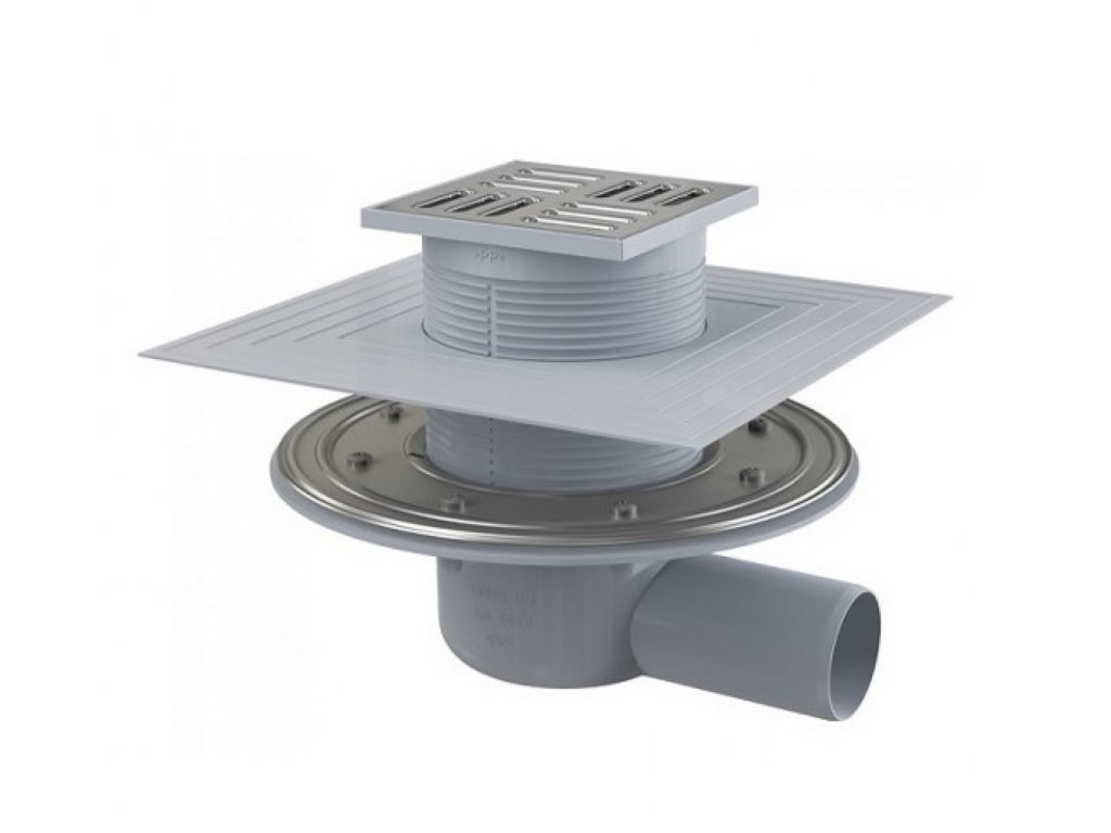 Podlahová vpusť značky Alcaplast, 105x105/50mm, bočná, s nerezovou mriežkou, nerezovou prírubou a límcom 2. úrovne izolácie, kombinovaná zápachová uzávera SMART.
