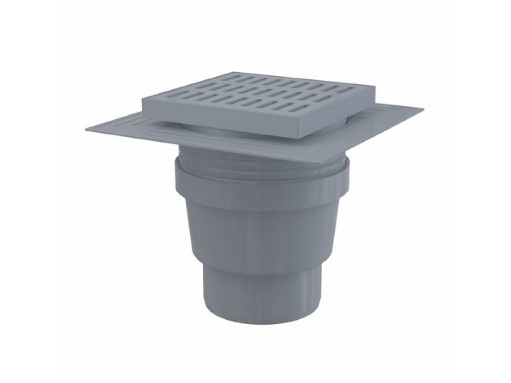 Podlahová vpusť 150×150/110 mm priama, mriežka šedá, límec 2. úrovne izolácie, vodná zápachová uzávera