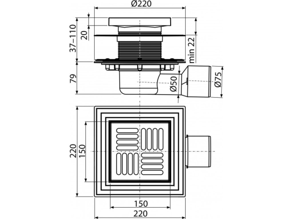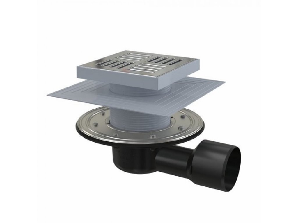 Podlahová vpusť 150×150/50/75 mm bočná, mriežka nerez, nerezová príruba a límec 2. úrovne izolácie, vodná a suchá zápachová uzáveraPoužitie: