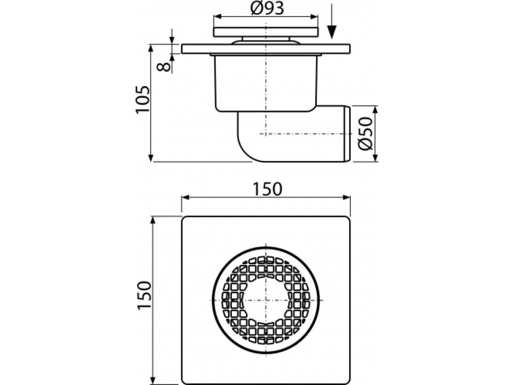 Podlahová vpusť 150×150/50 mm bočná, mriežka šedá, vodná zápachová uzáveraPoužitie: