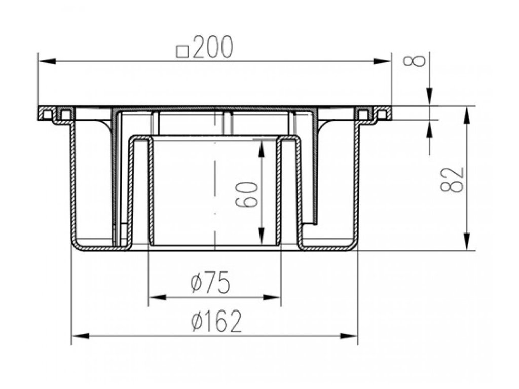 Podlahová vpusť spodná DN75, mriežka 200mm, vodná hladina