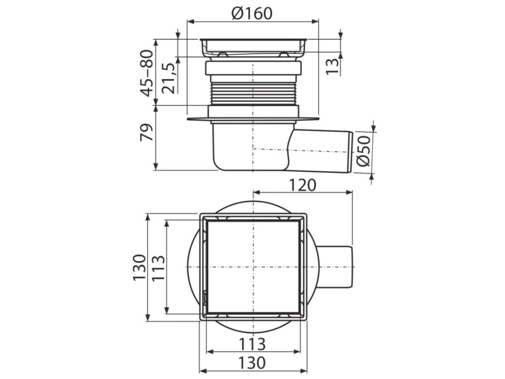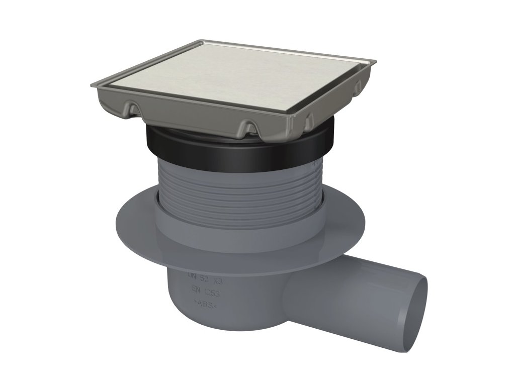 Podlahová vpusť 130×130 mm bočná, obojstranná nerezová mriežka, vodná zápachová uzávera