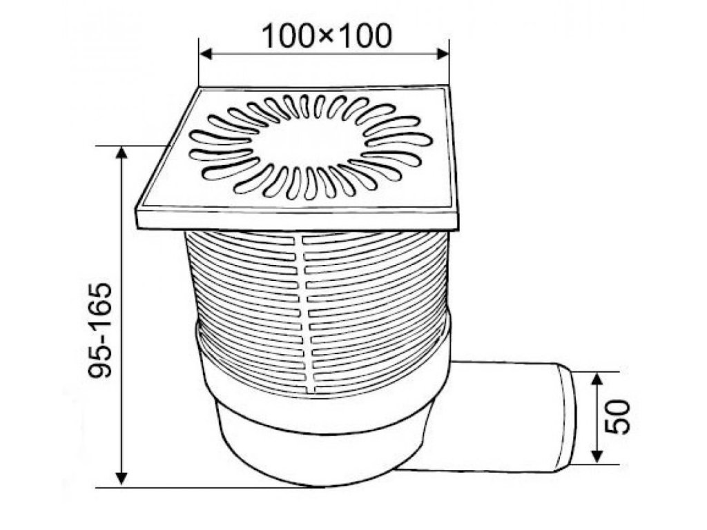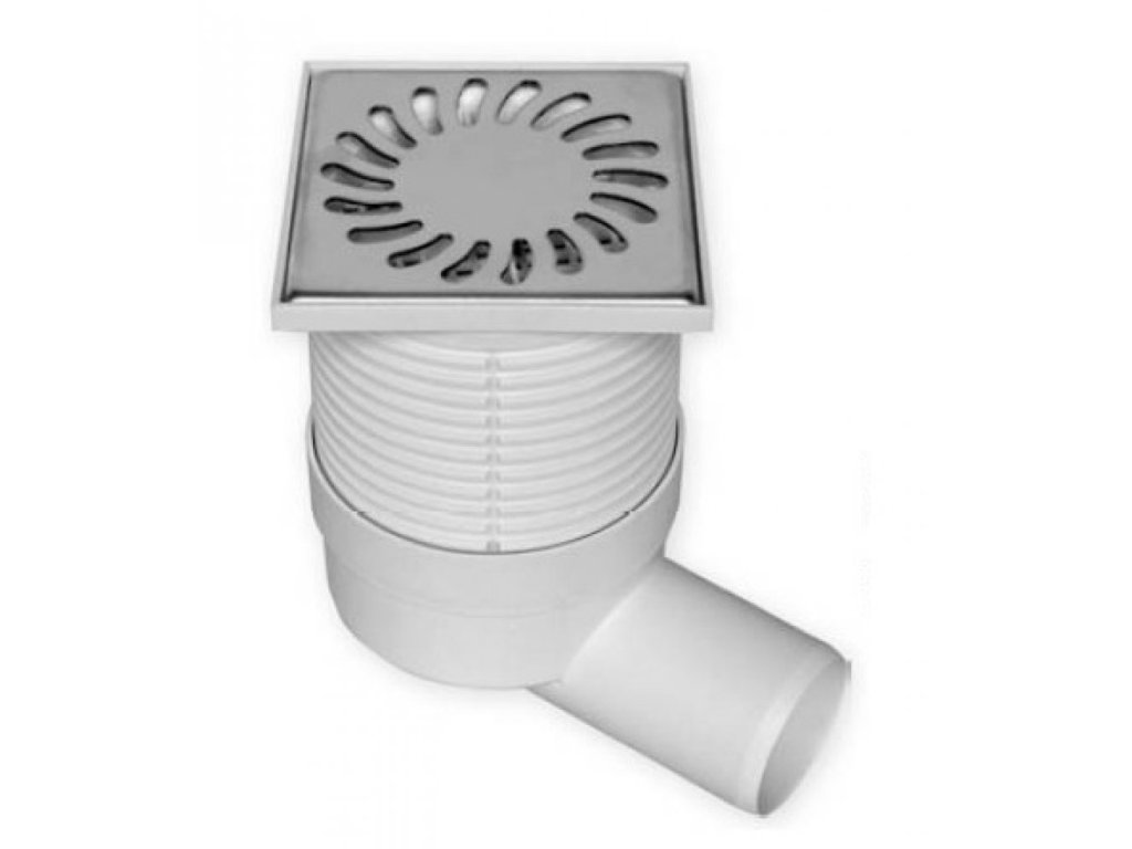 Bočná podlahová vpusť značky Chuděj, s vodnou hladinou, s nerezovou mriežkou 100x100mm, DN50.