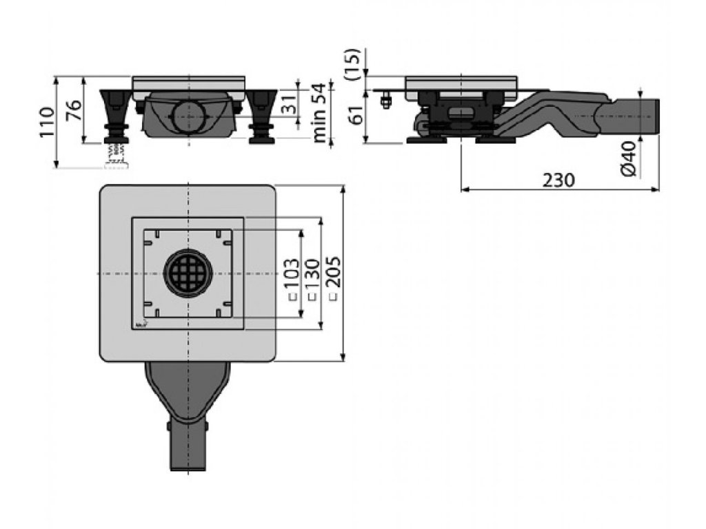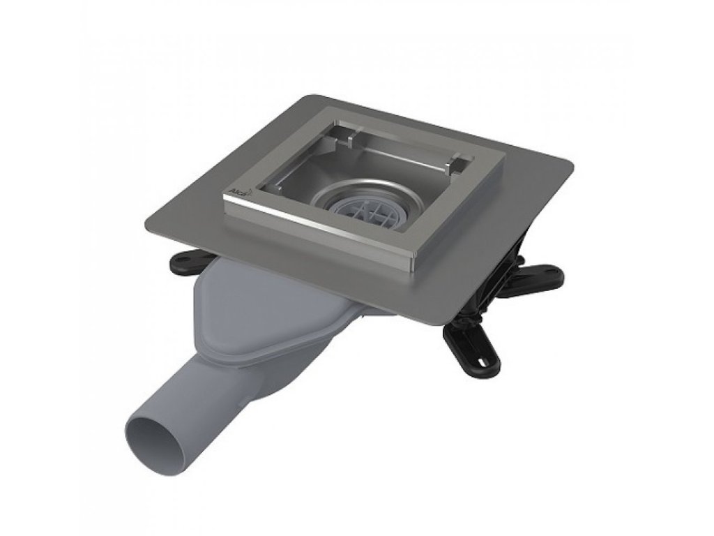 Nerezová podlahová vpusť značky Alcaplast, extra nízka 130x130mm, bočná, bez mriežky, vodná zápachová uzávera