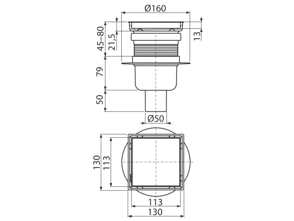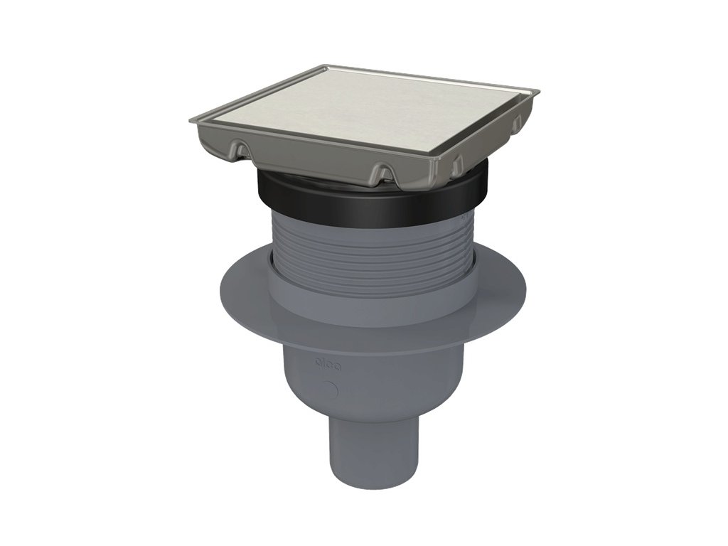 Podlahová vpusť ALCA 130×130 mm priama, obojstranná nerezová mriežka, kombinovaná zápachová uzávera.