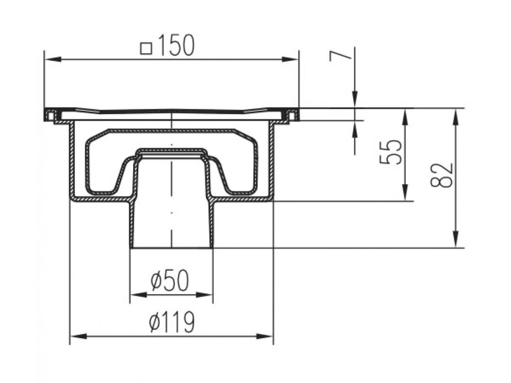 Podlahová vpusť spodná DN50/82, nerezová mriežka 150mm, s plavákom