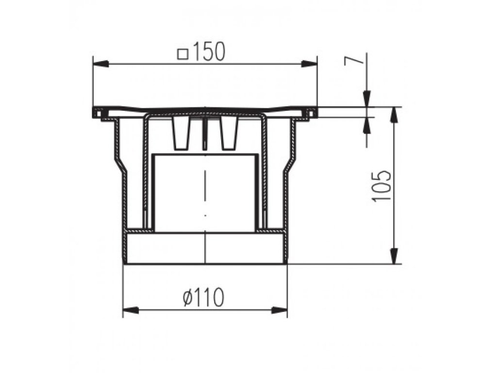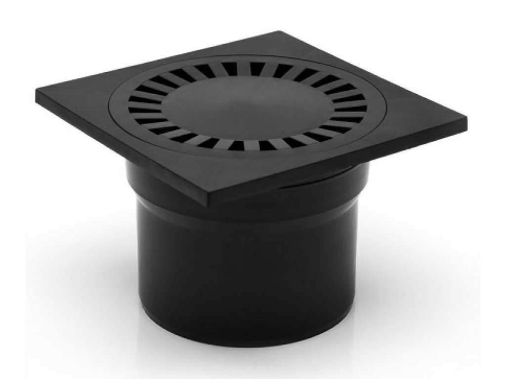 Spodná podlahová vpusť značky Chuděj, s vodnou hladinou, s plastovou mriežkou 150x150mm, DN110, farba čierna.
